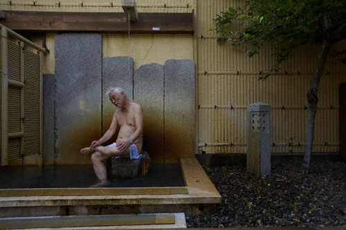 Taizo Noda, 72, from Osaka, enjoy the hot spring water inside the private Hoshu-no-Yu (meaning Star Spa) located inside the Hotel Subaru in Totsugawa village in the Nara Prefecture in the Kansai region of southern Japan. Mr. Noda believes the secret to his long healthy life has been waking up early everyday and taking hot Japanese style baths.